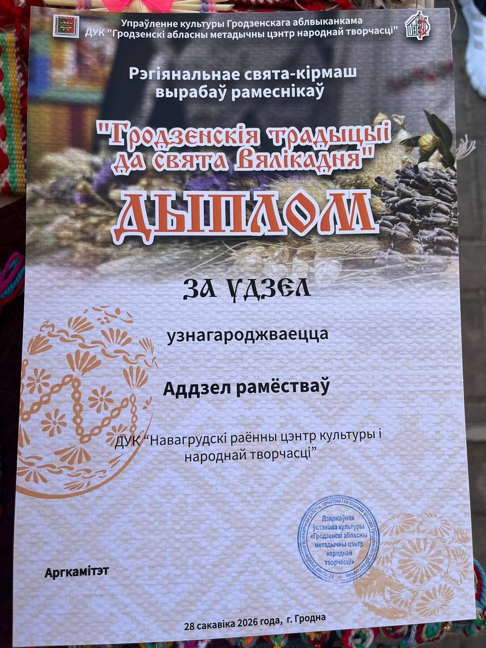 Отдел ремёсел Новогрудского районного центра культуры принимает участие в региональном празднике-ярмарке изделий ремесленников «Гродзенскія традыцыі да свята Вялікадня» в г. Гродно