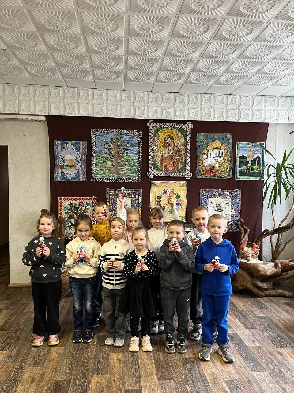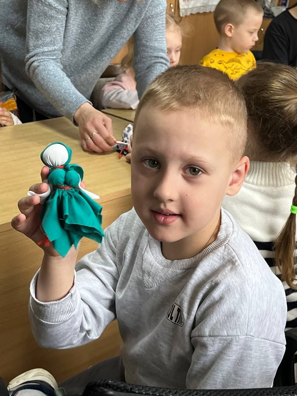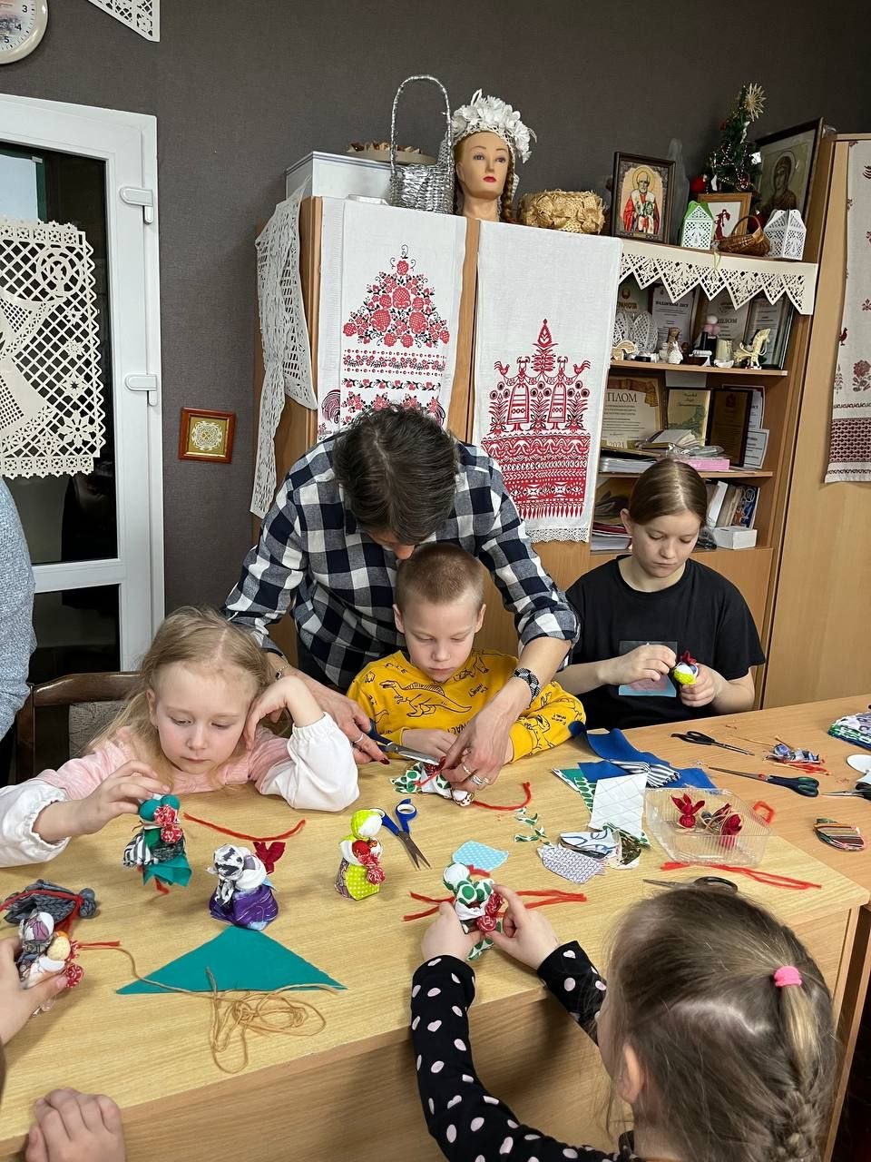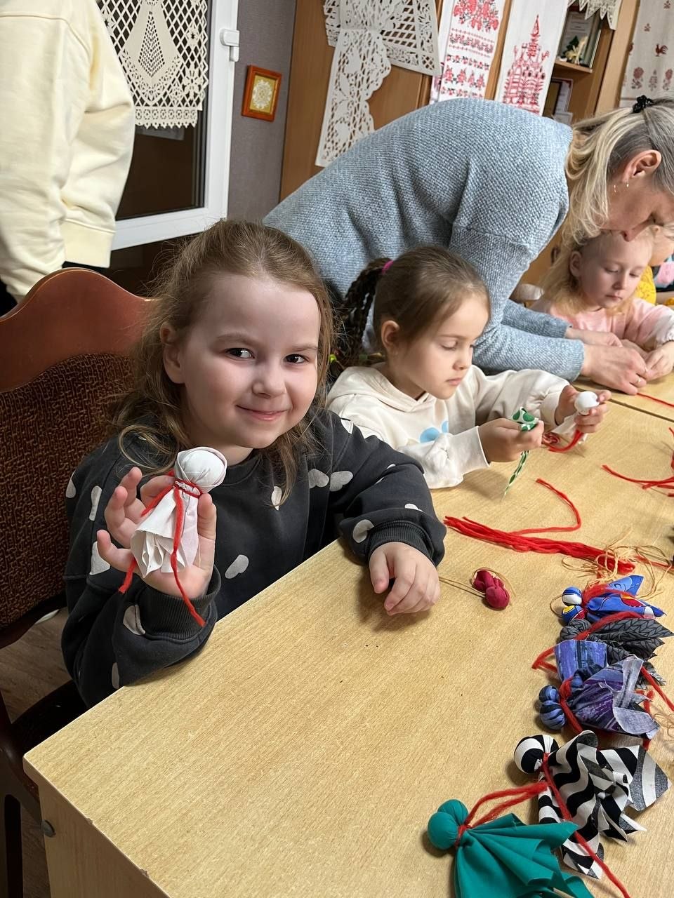 Детям было предложено своими руками смастерить этот простой, но очень символичный оберег. Под чутким руководством мастеров, малыши с энтузиазмом выбирали лоскутки, набивали кукол тканью и формировали ее облик. Каждый ребенок вложил в свою «Подорожницу» частичку души, создавая уникальную игрушку, которая станет не просто подарком, а своеобразным символом заботы и тепла.